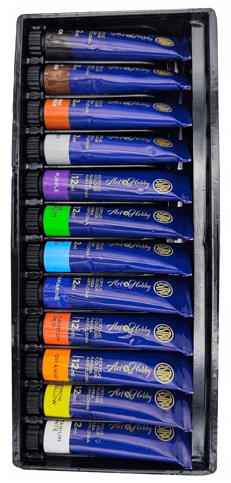 - Zestaw farb akrylowych w tubkach 12 kolorów po 12 ml to wszechstronny wybór dla artystów, oferujący 12 tubek po 12 ml każda.