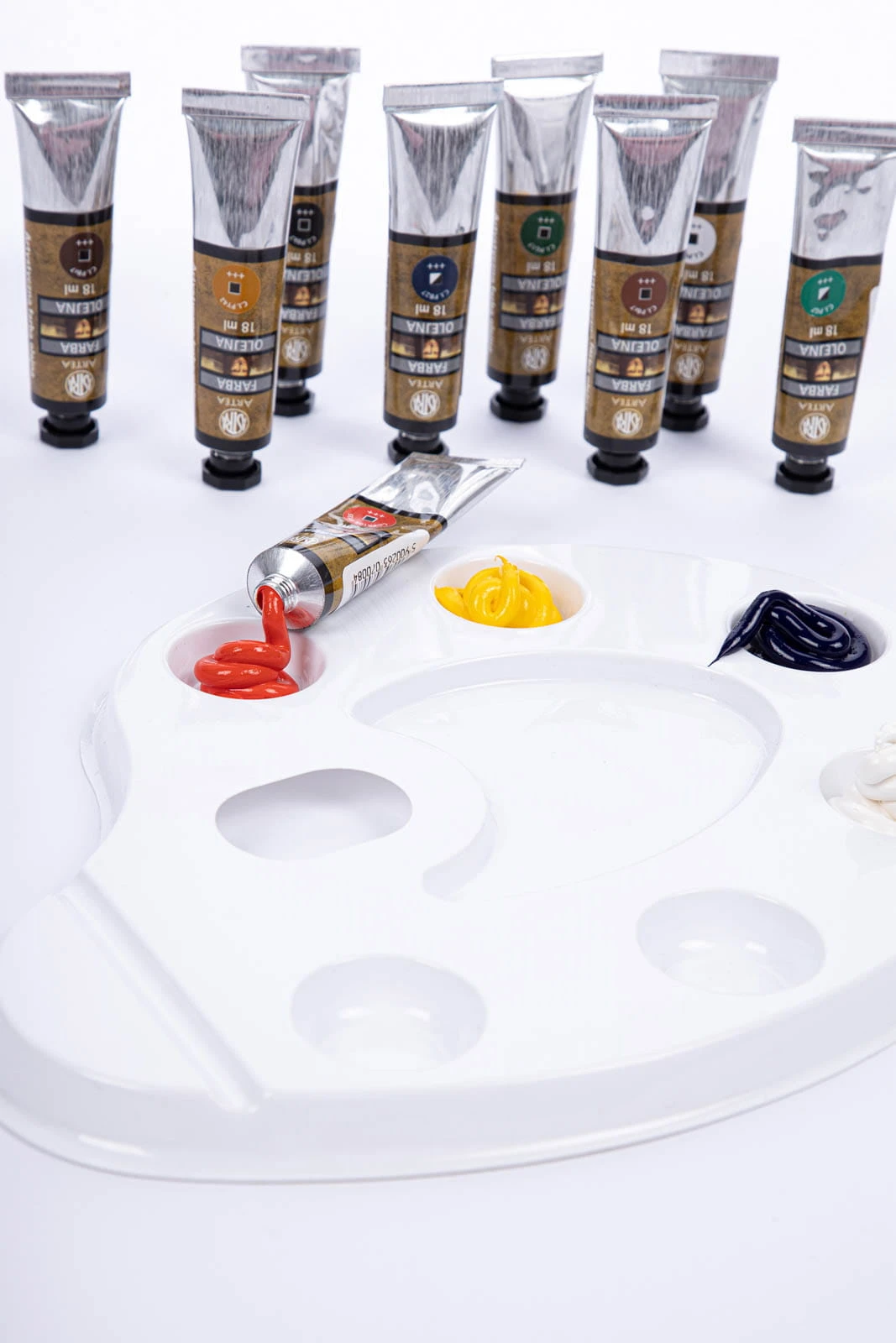 - Kolory w zestawie: biel cynkowa, umbra palona, ultramaryna niebieska, zieleń rembrandta, biel tytanowa, siena palona, czerń sadza, kadium żółty jasny, ugier żółty, błękit paryski, zieleń chromowana, kadium czerwony jasny