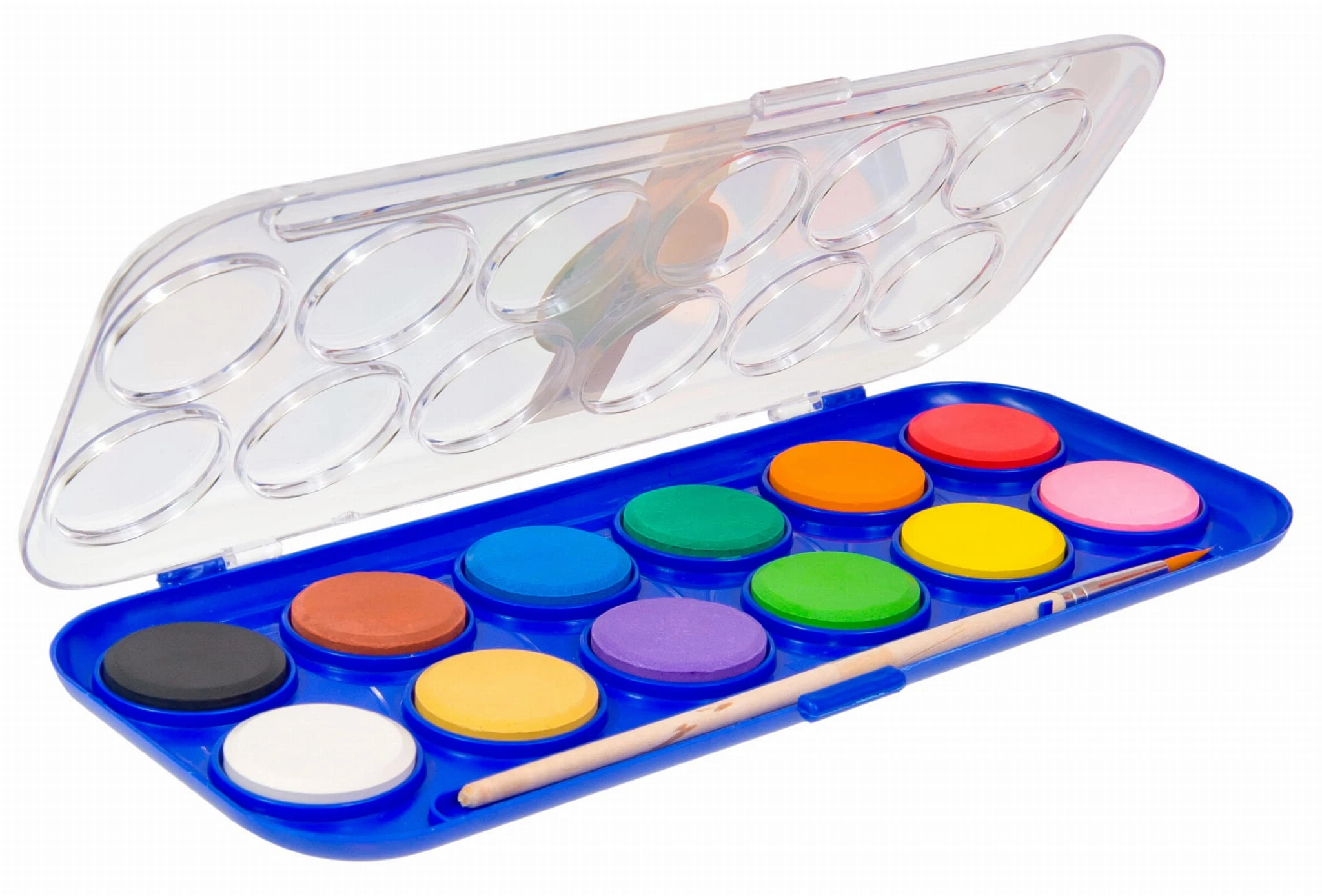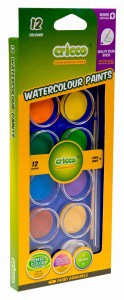 - Komplet 12 farb akwarelowych w plastikowej kasetce oraz zewnętrznym kartonowym opakowaniu z zawieszką.