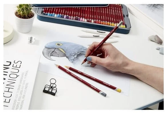 - Gruby, czteromilimetrowy rdzeń o delikatnej, pudrowej konsystencji pozwala mieszać barwy jak w przypadku pasteli w sztyfcie, przy czym umożliwia znacznie bardziej precyzyjną pracę.
