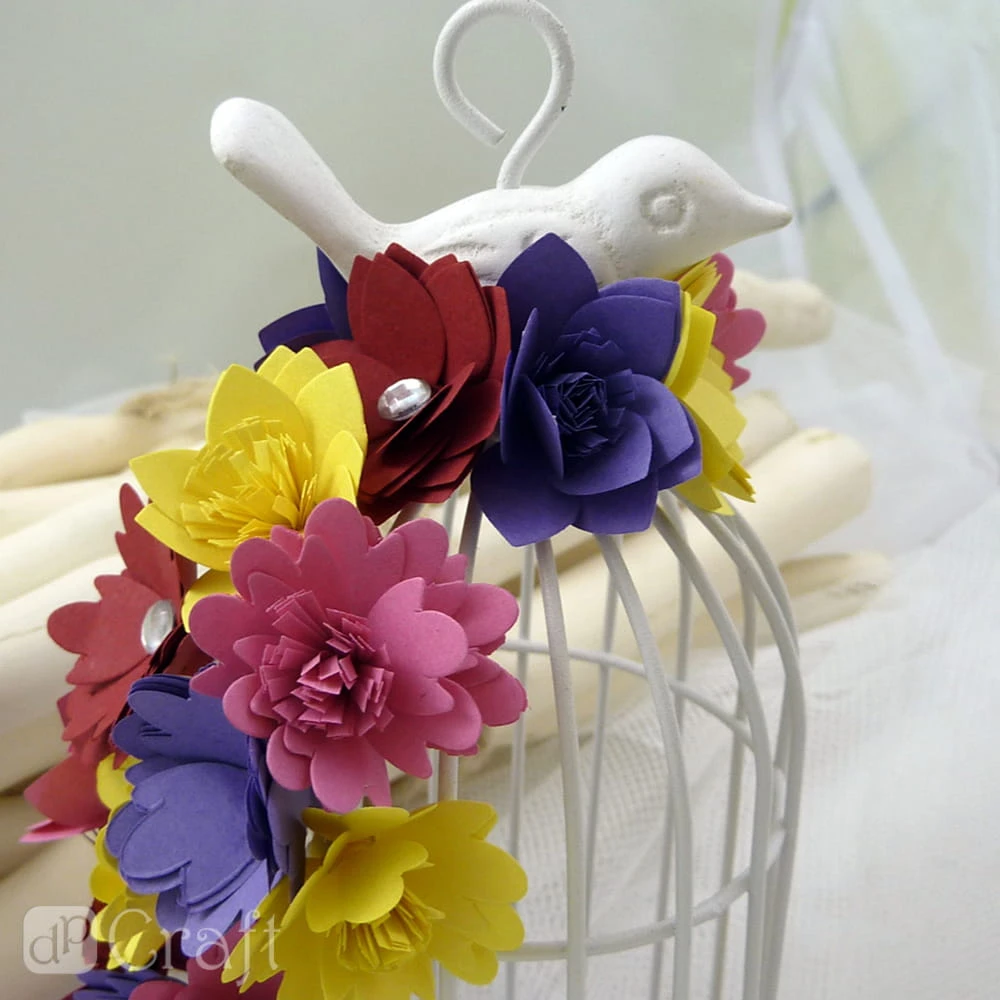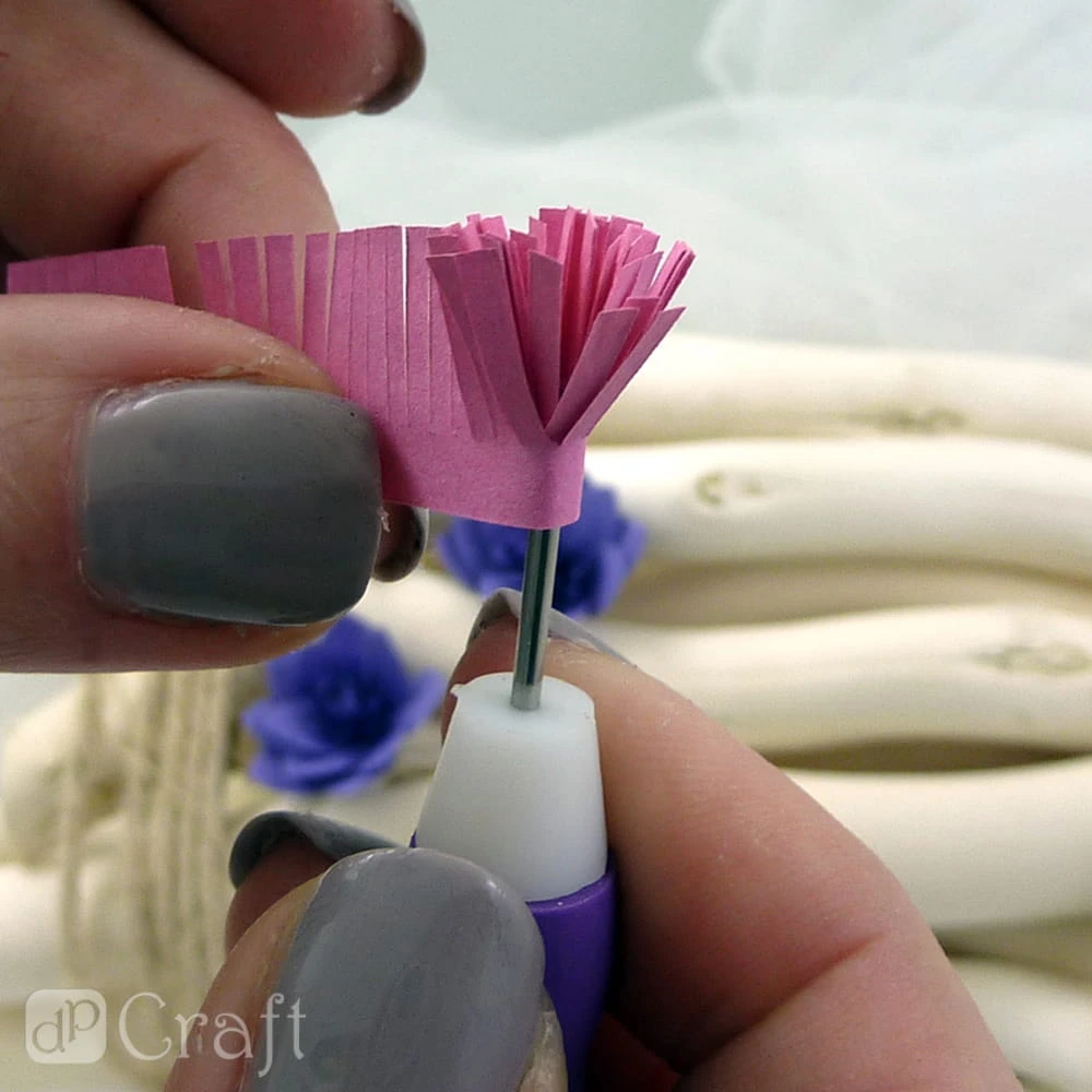 - Zwijanie zaczynamy od strony frędzli, z nich powstaną pręciki kwiatka, które otoczą płatki. Po zrolowaniu paska otrzymamy kwiatek, gotowy element dekoracyjny do wykorzystania w cardmakingu i scrapbookingu (do tworzenia kartek, albumów i innych projektów).