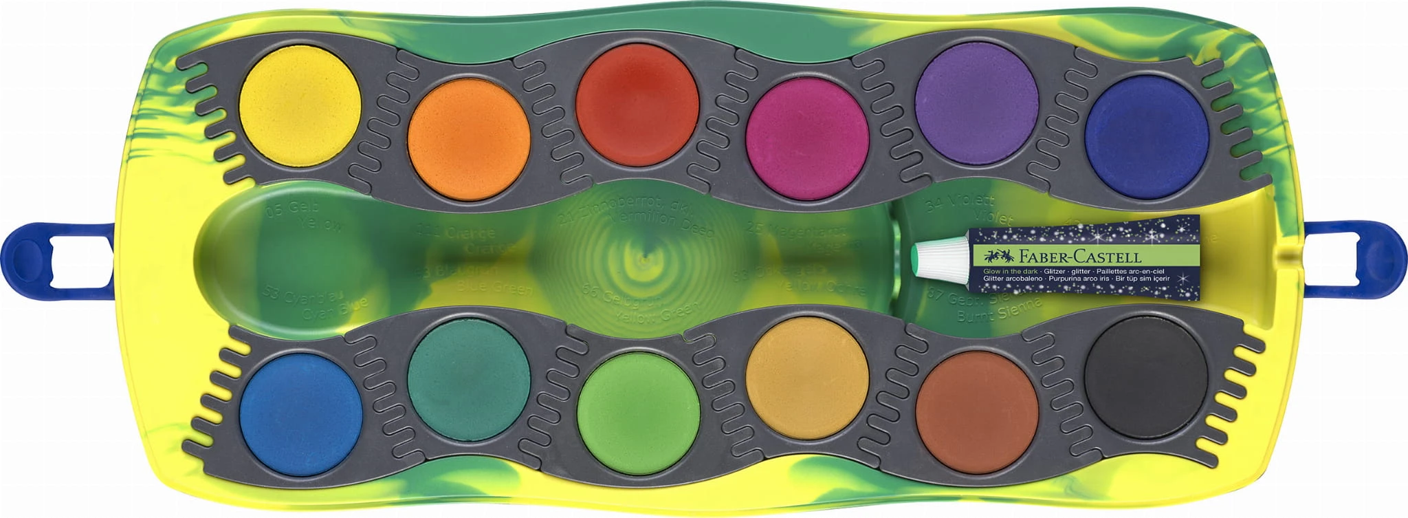 - Plastikowa paleta z przezroczystą pokrywą do wielokrotnego użytku wyposażona została w miejsce na imię i zintegrowane pola na mieszanie farb.