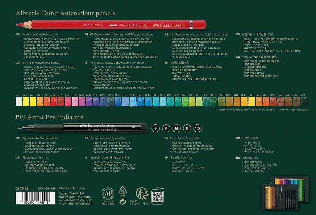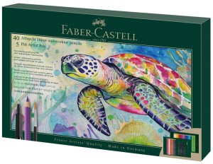 - Kredki akwarelowe Albrecht Dürer Faber-Castell w atrakcyjnym 46 elementowym zestawie prezentowym (40 kredek Albrecht Dürer + 5 pisaków Pit Artist Pen o końcówkami S, F, M, B i 1,5 + pędzelek).