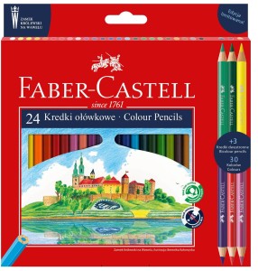 - W zestawie 24 kredki zwykłe oraz 3 trójkątne, co daje w sumie aż 30 kolorów.