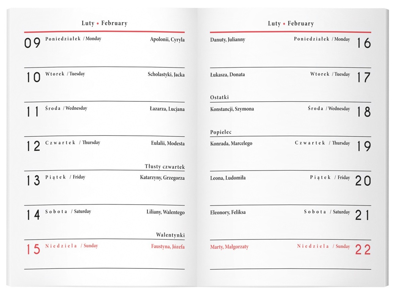 - Rozkład kalendarza: tygodniowy (1 tydzień na stronie).