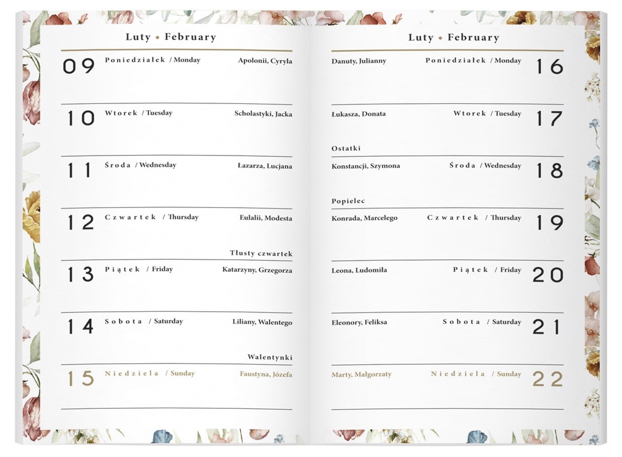 - Rozkład kalendarza: tygodniowy (1 tydzień na stronie).