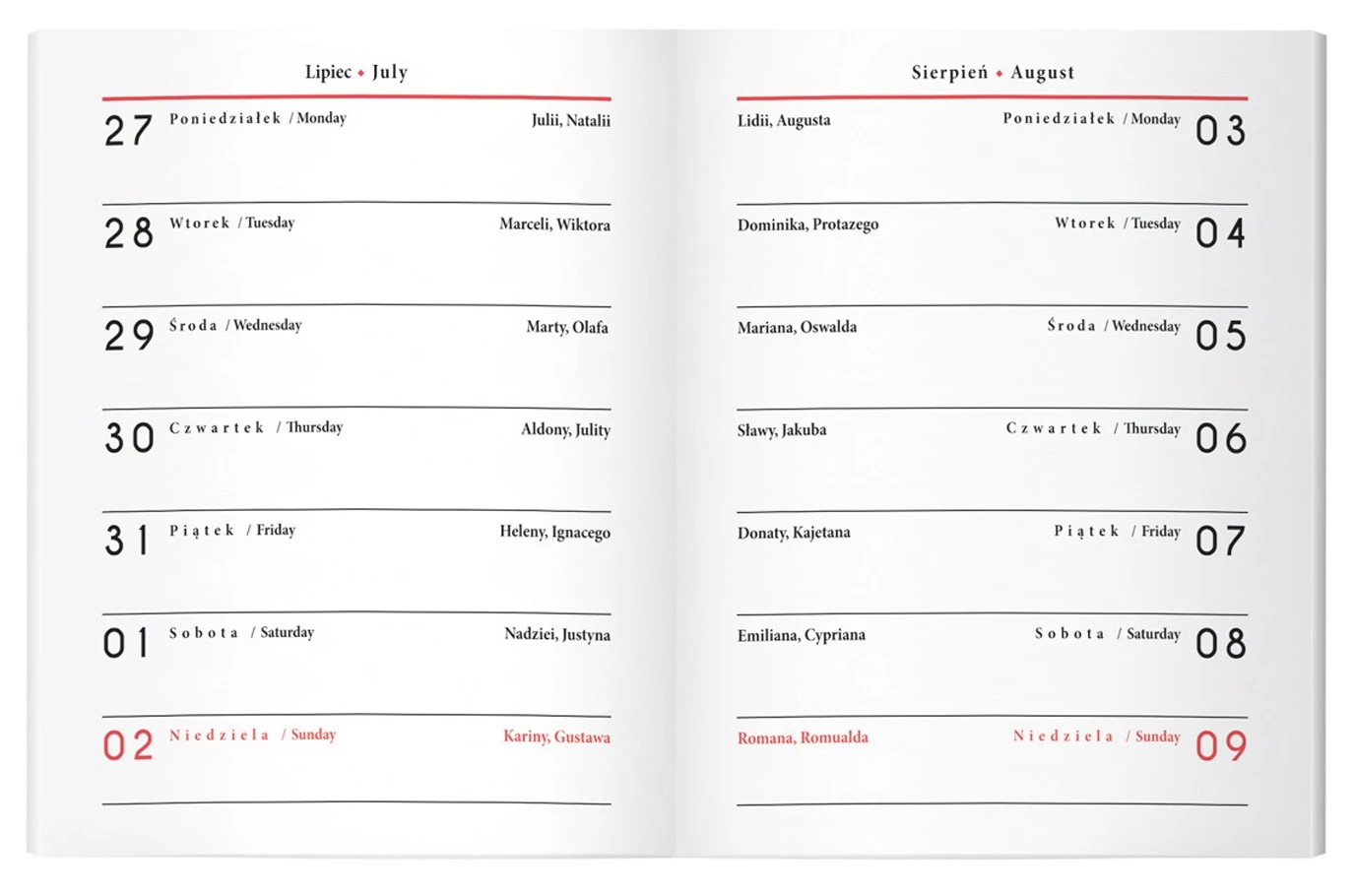 - Rozkład kalendarza: tygodniowy (1 tydzień na stronie).