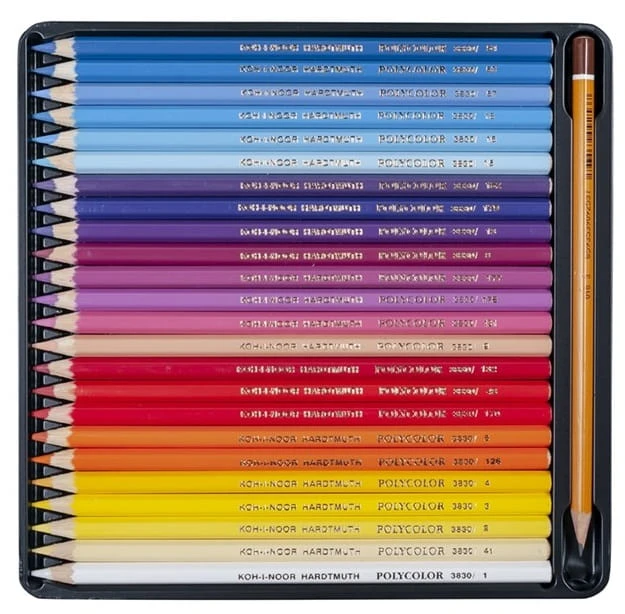 Polycolor są profesjonalnymi kredkami artystycznymi. Zostały wykonane z najwyższej jakości materiałów, dzięki czemu zapewniają miękki rysowanie, trwałe i intensywne kolory. Ich oprawki wykonane są z wysokiej jakości drewna cedrowego oraz polakierowane kilkunastoma warstwami lakieru. Kredki posiadają zaokrąglednia w kolorze złotym.