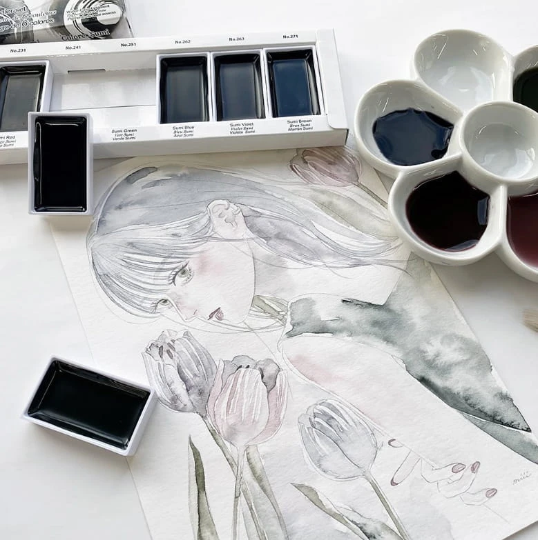 - Świetnie się mieszają. Doskonałe do rozmaitych technik wodnych, ilustracji, tradycyjnego malarstwa sumi-e czy etagami.