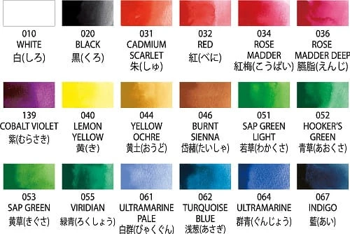 - Kolory w zestawie: 010 White, 020 Black, 031 Cadmium Scarlet, 032 Red, 034 Rose Madder, 036 Rose Madder Deep, 139 Cobalt Violet, 040 Lemon Yellow, 044 Yellow Ochre, 046 Burnt Sienna, 051 Sap Green Light, 052 Hooker's Green, 053 Sap Green, 055 Viridian, 061 Ultramarine Pale, 062 Turquoise Blue, 064 Ultramarine, 067 Indigo