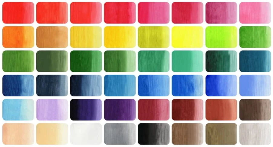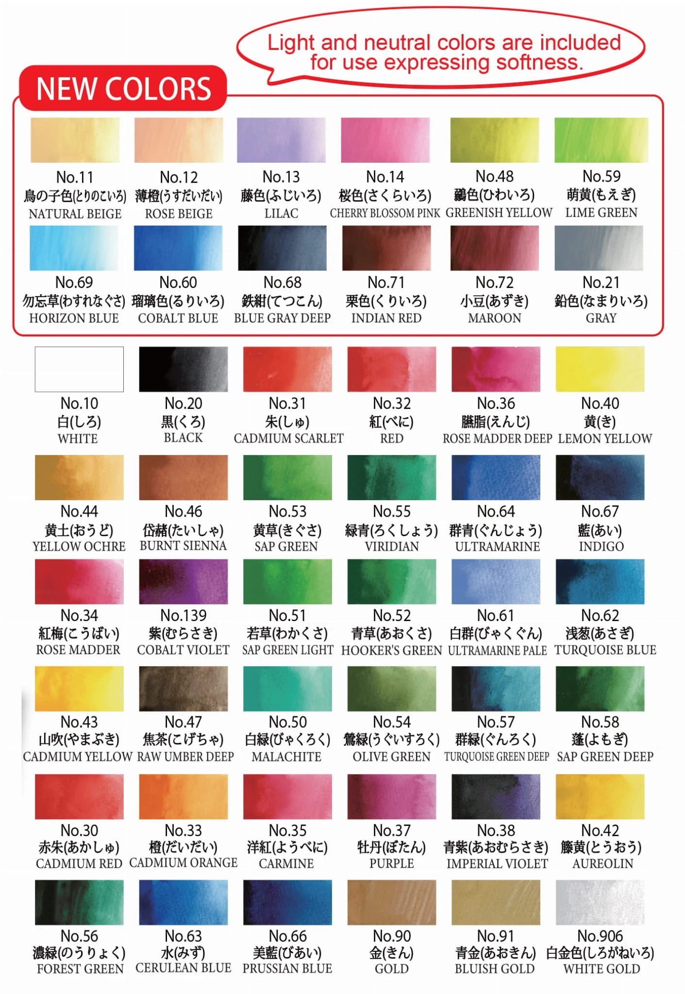 - Kolory w zestawie: 011 Natural Beige, 012 Rose Beige, 013 Lilac, 014 Cherry Blossom Pink, 048 Greenish Yellow, 069 Horizon Blue, 060 Cobalt Blue, 068 Blue Gray Deep, 071 Indian Red, 072 Maroon, 021 Gray, 010 White, 020 Black, 031 Cadmium Scarlet, 032 Red, 036 Rose Madder Deep, 040 Lemon Yellow, 044 Yellow Ochre, 046 Burnt Sienna, 053 Sap Green, 055 Viridian, 064 Ultramarine, 067 Indigo, 034 Rose Madder, 139 Cobalt Violet, 051 Sap Green Light, 052 Hooker's Green, 061 Ultramarine Pale, 062 Turquoise Blue, 043 Cadmium Yellow, 047 Raw Umber Deep, 050 Malachite, 054 Olive Green, 057 Turquoise Deep Green, 058 Sap Green Deep, 030 Cadmium Red, 033 Cadmium Orange, 035 Carmine, 037 Purple, 038 Imperial Violet, 042 Aureolin, 056 Forest Green, 063 Cerulean Blue, 066 Prussian Blue, 090 Gold, 091 Bluish Gold, 906 White Gold