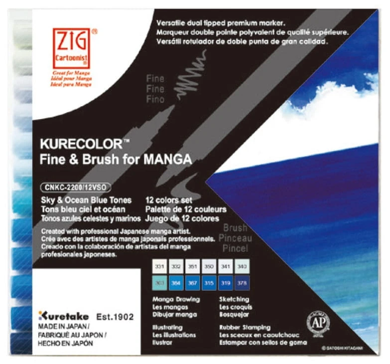 - Zestaw zawiera 12 markerów Fine & Brush for Manga w odcieniach błękitu, idealnych do malowania m.in. oceanów i nieba.