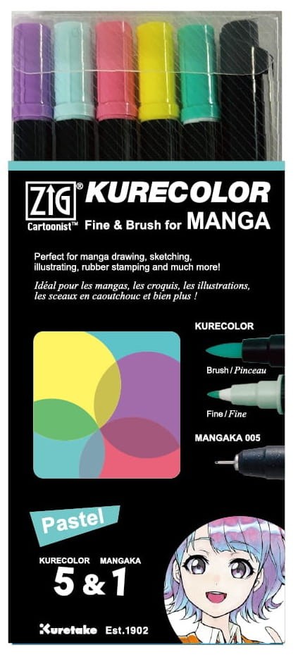 - Zestaw do mangi "Pastel" zawiera markery Kurecolor Fine&Brush w odcieniach 634 Light Violet, 303 Light Blue, 204 light Carmine, 102 Lemon Yellow, 532 Aqua oraz cienkopis Mangaka Black 005.