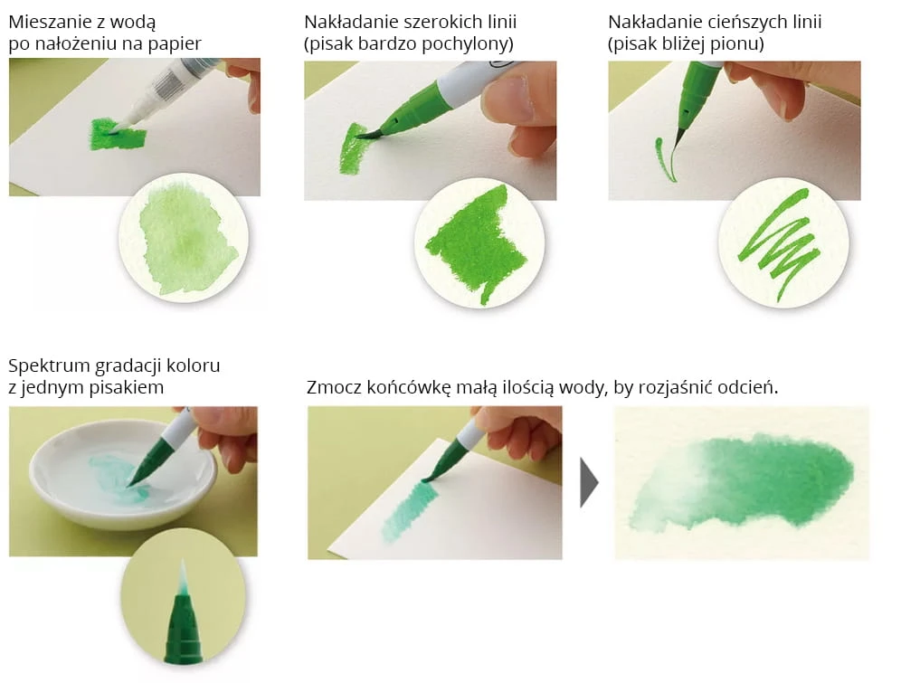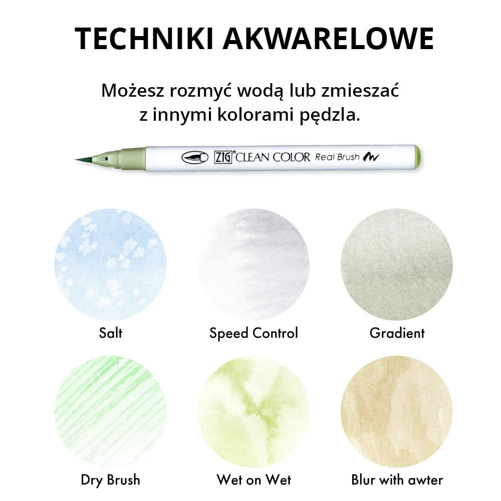 - Clean Color Real Brush firmy Kuretake to pisak wyjątkowy - posiada prawdziwą pędzelkową końcówkę, wykonaną z syntetycznego włosia.