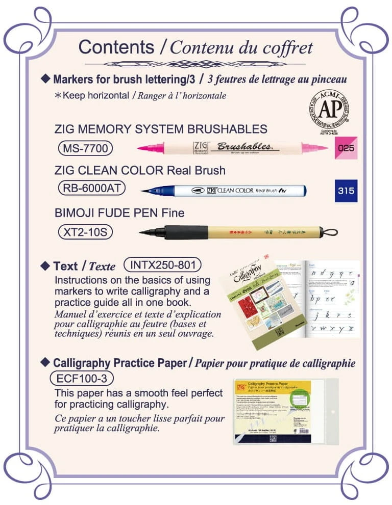 - Komplet zawiera: ZIG MEMORY SYSTEM BRUSHABLES w kolorze 025 Pure Pink (dwustronny pisak do kaligrafii zawierający dwa odcienie danego koloru - jaśniejszy oraz ciemniejszy, co pozwala na uzyskanie efektu cieniowania zarówno w szkicach jak i liternictwie); ZIG CLEAN COLOR Real Brush w kolorze 315 Ultramarine Blue (precyzyjna końcówka pędzelkowa z włosia); KURETAKE BIMOJI FUDE PEN z końcówką Fine (wygodna i ergonomiczna obudowa nawiązuje designem i wagą do tradycyjnych pędzli kaligraficznych. Wodny tusz pigmentowy jest wodoodporny po wyschnięciu); ZIG CALLIGRAPHY PRACTICE PAPER - 80 arkuszy papieru do ćwiczeń kaligraficznych; oraz ZIG CALLIGRAPHY HANDBOOK - poręczna, bogato ilustrowana książeczka zawierająca wiele przydatnych kaligraficznych wskazówek (w języku japońskim oraz angielskim).