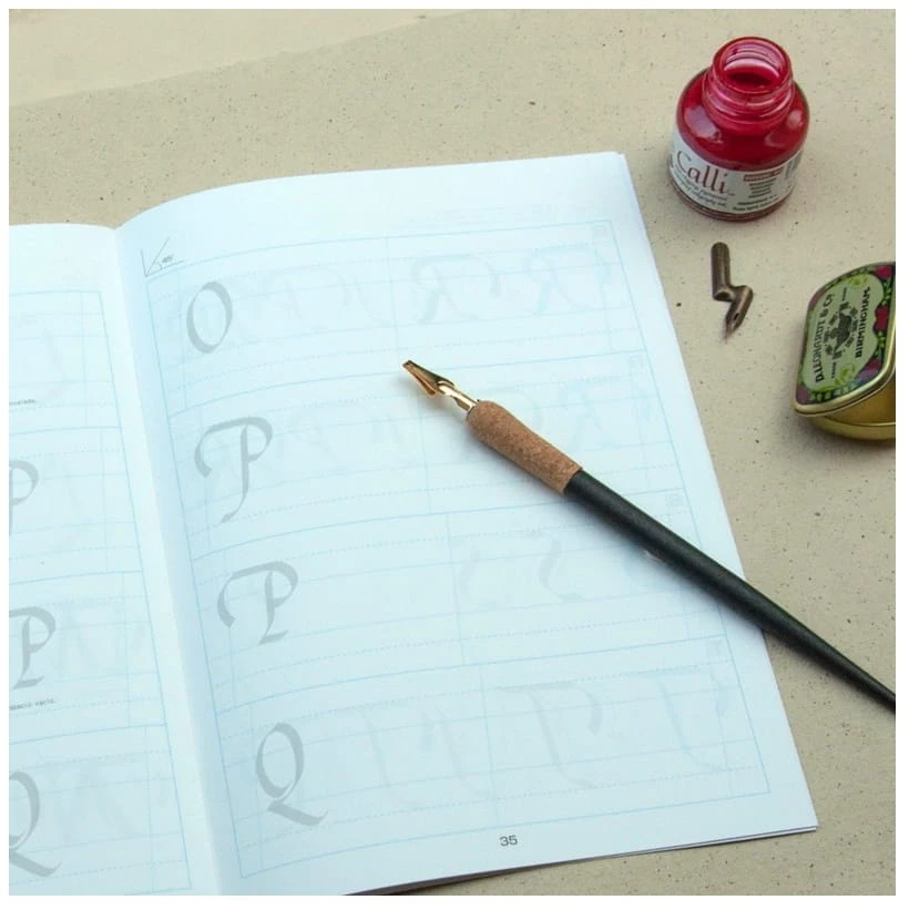Zeszyt do kaligrafii z miejscem na ćwiczenia. Ukierunkowany na naukę kroju pisma Italic (italika). Zaczyna od wyjaśnienia podstaw - jak trzymać pisak, jakie pisaki nadają się do tego pisma - następnie tłumaczy każda literę i cyfrę oddzielnie. Pokazuje również techniki na dekorowanie napisów lub całych stron.
