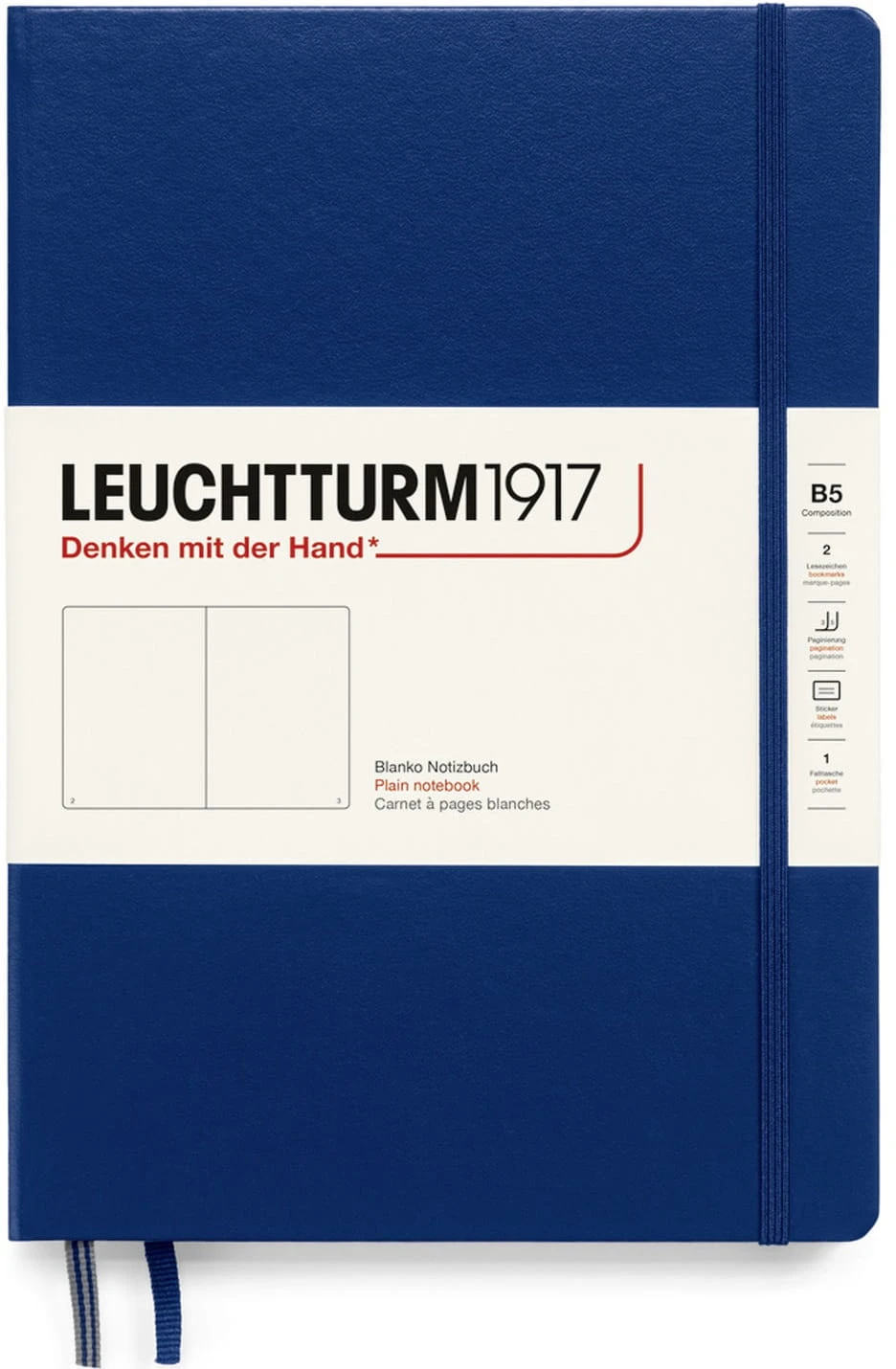 Notatniki Leuchtturm1917 z klasycznej serii Composition to wysokiej klasy produkt w rozmiarze B5 i twardej oprawie. Papier ma odcień kości słoniowej, jest bezkwasowy i bez optycznych wybielaczy, idealny do pisania piórem. Wewnątrz znajduje się pełen zestaw akcesoriów umożliwiających łatwą archiwizację: komplet naklejek do opisania okładki i grzbietu, kieszeń na luźne notatki, strona tytułowa oraz pusta tabela spisu do opisania zawartości ponumerowanych stron. Dodatkowym atutem jest szyty grzbiet umożliwiający rozłożenie notatnika na płasko.