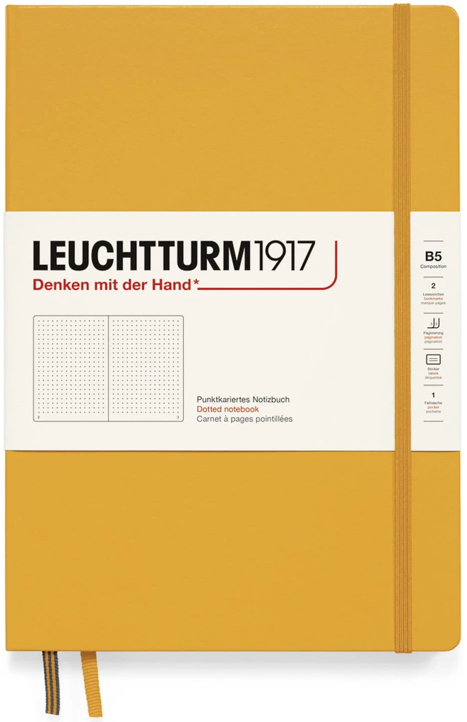 Notatniki Leuchtturm1917 z klasycznej serii Composition to wysokiej klasy produkt w rozmiarze B5 i twardej oprawie. Papier ma odcień kości słoniowej, jest bezkwasowy i bez optycznych wybielaczy, idealny do pisania piórem. Wewnątrz znajduje się pełen zestaw akcesoriów umożliwiających łatwą archiwizację: komplet naklejek do opisania okładki i grzbietu, kieszeń na luźne notatki, strona tytułowa oraz pusta tabela spisu do opisania zawartości ponumerowanych stron. Dodatkowym atutem jest szyty grzbiet umożliwiający rozłożenie notatnika na płasko.