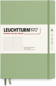 Notatniki Leuchtturm1917 z klasycznej serii Composition to wysokiej klasy produkt w rozmiarze B5 i twardej oprawie. Papier ma odcień kości słoniowej, jest bezkwasowy i bez optycznych wybielaczy, idealny do pisania piórem. Wewnątrz znajduje się pełen zestaw akcesoriów umożliwiających łatwą archiwizację: komplet naklejek do opisania okładki i grzbietu, kieszeń na luźne notatki, strona tytułowa oraz pusta tabela spisu do opisania zawartości ponumerowanych stron. Dodatkowym atutem jest szyty grzbiet umożliwiający rozłożenie notatnika na płasko.