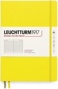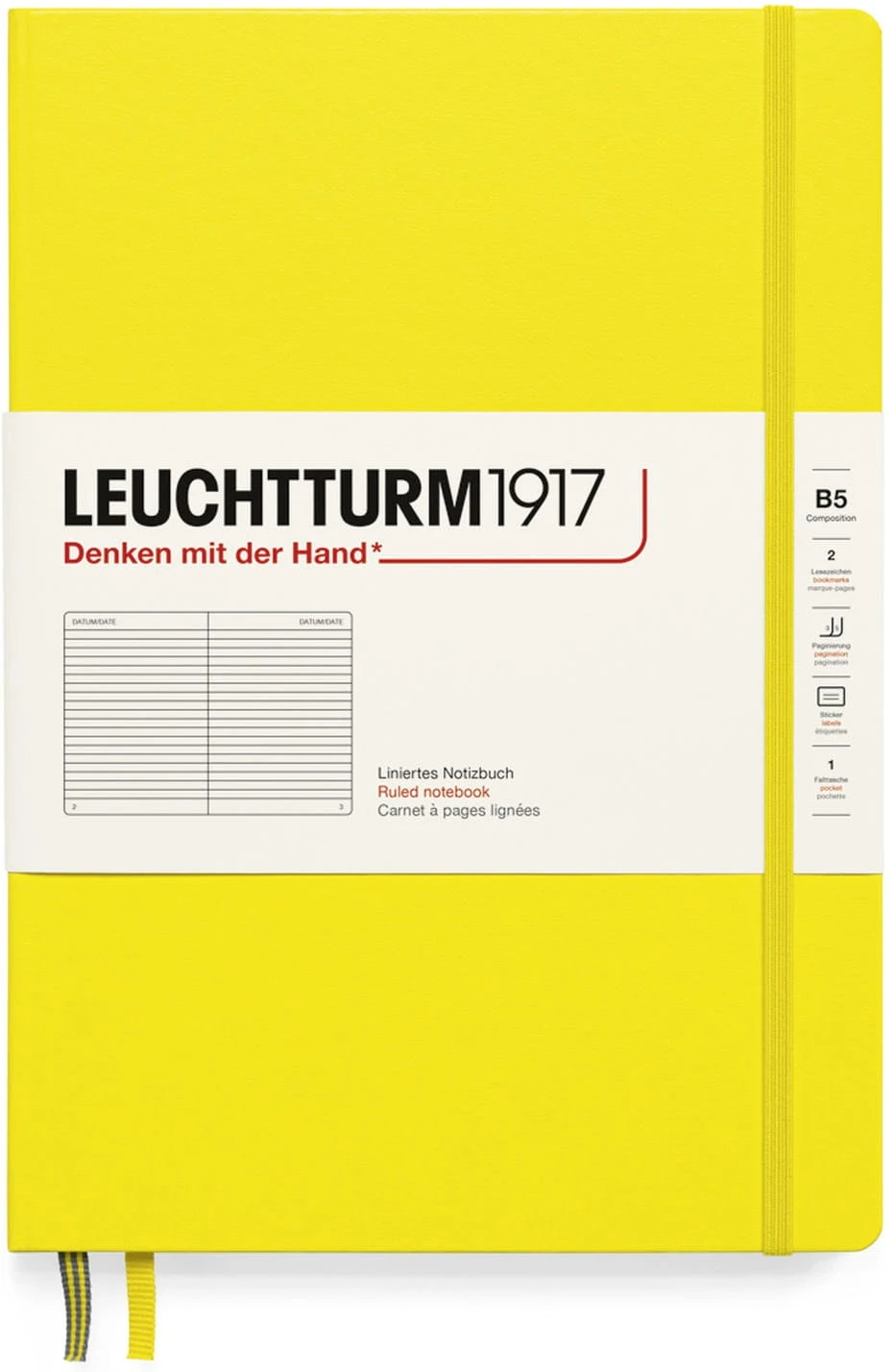 Notatniki Leuchtturm1917 z klasycznej serii Composition to wysokiej klasy produkt w rozmiarze B5 i twardej oprawie. Papier ma odcień kości słoniowej, jest bezkwasowy i bez optycznych wybielaczy, idealny do pisania piórem. Wewnątrz znajduje się pełen zestaw akcesoriów umożliwiających łatwą archiwizację: komplet naklejek do opisania okładki i grzbietu, kieszeń na luźne notatki, strona tytułowa oraz pusta tabela spisu do opisania zawartości ponumerowanych stron. Dodatkowym atutem jest szyty grzbiet umożliwiający rozłożenie notatnika na płasko.