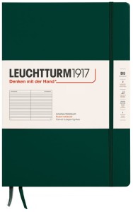 Notatniki Leuchtturm1917 z klasycznej serii Composition to wysokiej klasy produkt w rozmiarze B5 i twardej oprawie. Papier ma odcień kości słoniowej, jest bezkwasowy i bez optycznych wybielaczy, idealny do pisania piórem. Wewnątrz znajduje się pełen zestaw akcesoriów umożliwiających łatwą archiwizację: komplet naklejek do opisania okładki i grzbietu, kieszeń na luźne notatki, strona tytułowa oraz pusta tabela spisu do opisania zawartości ponumerowanych stron. Dodatkowym atutem jest szyty grzbiet umożliwiający rozłożenie notatnika na płasko.