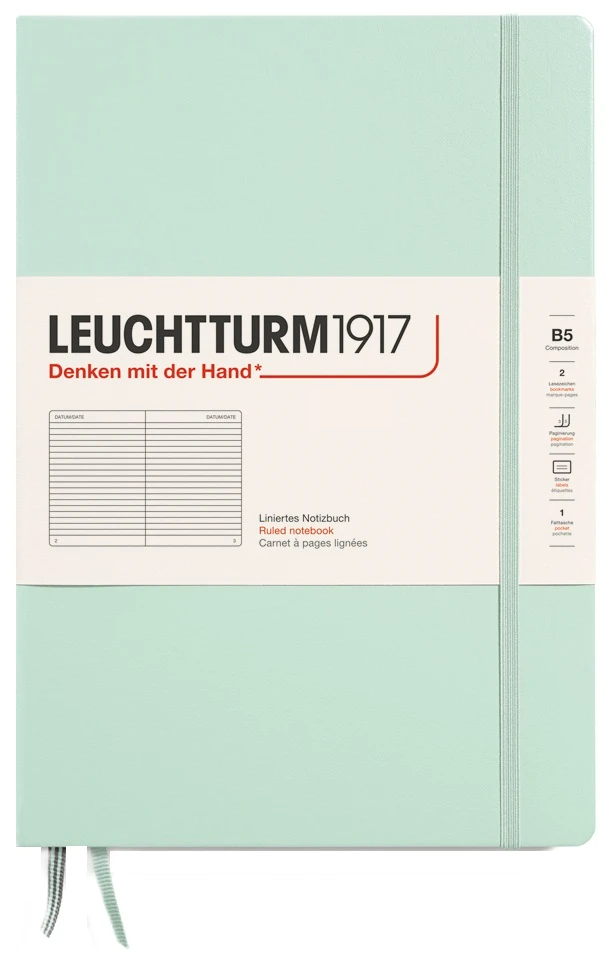 Notatniki Leuchtturm1917 z klasycznej serii Composition to wysokiej klasy produkt w rozmiarze B5 i twardej oprawie. Papier ma odcień kości słoniowej, jest bezkwasowy i bez optycznych wybielaczy, idealny do pisania piórem. Wewnątrz znajduje się pełen zestaw akcesoriów umożliwiających łatwą archiwizację: komplet naklejek do opisania okładki i grzbietu, kieszeń na luźne notatki, strona tytułowa oraz pusta tabela spisu do opisania zawartości ponumerowanych stron. Dodatkowym atutem jest szyty grzbiet umożliwiający rozłożenie notatnika na płasko.