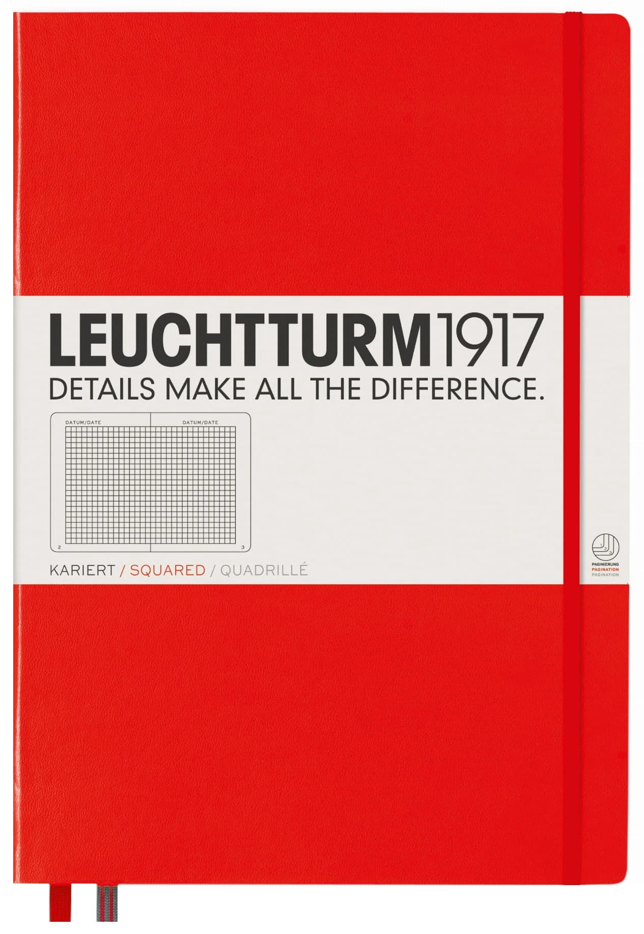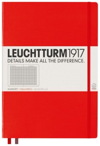 Notatniki Leuchtturm1917 z klasycznej serii Master to wysokiej klasy produkt w rozmiarze A4 i twardej oprawie. Papier ma odcień kości słoniowej, jest bezkwasowy i bez optycznych wybielaczy, idealny do pisania piórem. Wewnątrz znajduje się pełen zestaw akcesoriów umożliwiających łatwą archiwizację: komplet naklejek do opisania okładki i grzbietu, kieszeń na luźne notatki, strona tytułowa oraz pusta tabela spisu do opisania zawartości ponumerowanych stron. Dodatkowym atutem jest szyty grzbiet umożliwiający rozłożenie notatnika na płasko.