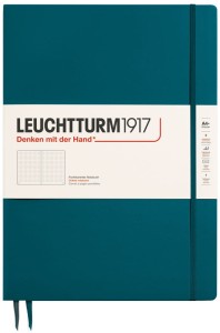 Notatniki Leuchtturm1917 z klasycznej serii Master Slim to wysokiej klasy produkt w rozmiarze A4 i twardej oprawie. Notatnik A4+ jest nieco większy od formatu A4, dzięki czemu pomiędzy stronami lub w kieszeni na okładce bezpiecznie pomieści kartki A4 z zapiskami lub kopiami. Notatniki z serii Slim mają 123 strony i są o 33% lżejsze od notatników Master Classic. Papier ma odcień kości słoniowej, jest bezkwasowy i bez optycznych wybielaczy, idealny do pisania piórem. Wewnątrz znajduje się pełen zestaw akcesoriów umożliwiających łatwą archiwizację: komplet naklejek do opisania okładki i grzbietu, kieszeń na luźne notatki, strona tytułowa oraz pusta tabela spisu do opisania zawartości ponumerowanych stron. Dodatkowym atutem jest szyty grzbiet umożliwiający rozłożenie notatnika na płasko.