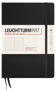Notatniki Leuchtturm1917 z klasycznej serii Medium to wysokiej klasy produkt w rozmiarze A5 i twardej oprawie. Papier ma odcień kości słoniowej, jest bezkwasowy i bez optycznych wybielaczy, idealny do pisania piórem. Wewnątrz znajduje się pełen zestaw akcesoriów umożliwiających łatwą archiwizację: komplet naklejek do opisania okładki i grzbietu, kieszeń na luźne notatki, strona tytułowa oraz pusta tabela spisu do opisania zawartości ponumerowanych stron. Dodatkowym atutem jest szyty grzbiet umożliwiający rozłożenie notatnika na płasko.