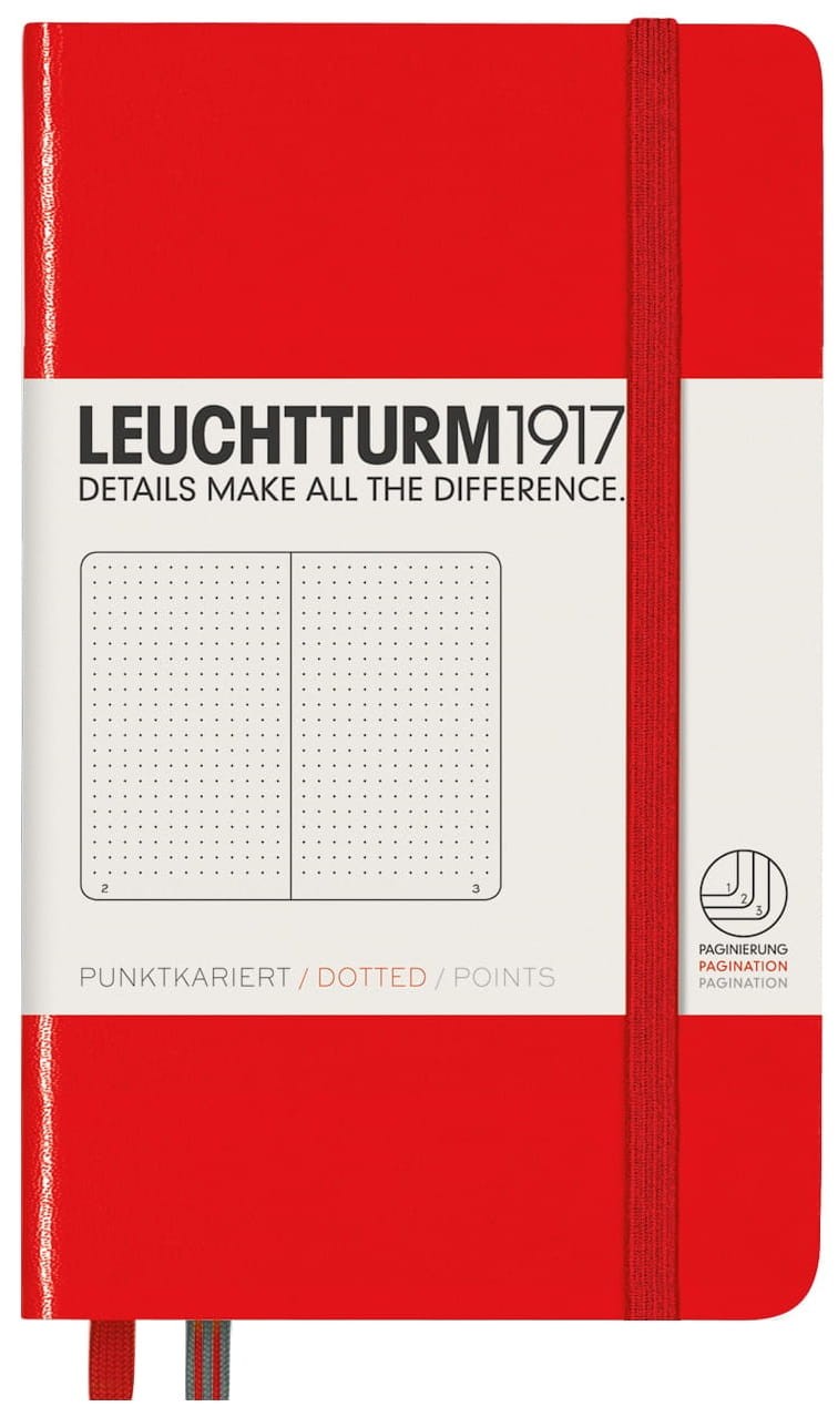 Notatniki Leuchtturm1917 z serii Pocket to wysokiej klasy produkt w rozmiarze A6 i twardej oprawie. Papier ma odcień kości słoniowej, jest bezkwasowy i bez optycznych wybielaczy, idealny do pisania piórem. Wewnątrz znajduje się pełen zestaw akcesoriów umożliwiających łatwą archiwizację: komplet naklejek do opisania okładki i grzbietu, kieszeń na luźne notatki, strona tytułowa oraz pusta tabela spisu do opisania zawartości ponumerowanych stron. Dodatkowym atutem jest szyty grzbiet umożliwiający rozłożenie notatnika na płasko. Dzięki małemu rozmiarowi notatnik zmieści się do każdej małej torby, a nawet do kieszeni.