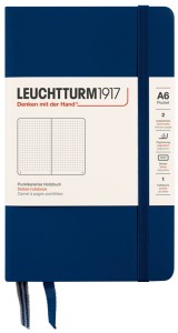 Notatniki Leuchtturm1917 z serii Pocket to wysokiej klasy produkt w rozmiarze A6 i twardej oprawie. Papier ma odcień kości słoniowej, jest bezkwasowy i bez optycznych wybielaczy, idealny do pisania piórem. Wewnątrz znajduje się pełen zestaw akcesoriów umożliwiających łatwą archiwizację: komplet naklejek do opisania okładki i grzbietu, kieszeń na luźne notatki, strona tytułowa oraz pusta tabela spisu do opisania zawartości ponumerowanych stron. Dodatkowym atutem jest szyty grzbiet umożliwiający rozłożenie notatnika na płasko. Dzięki małemu rozmiarowi notatnik zmieści się do każdej małej torby, a nawet do kieszeni.