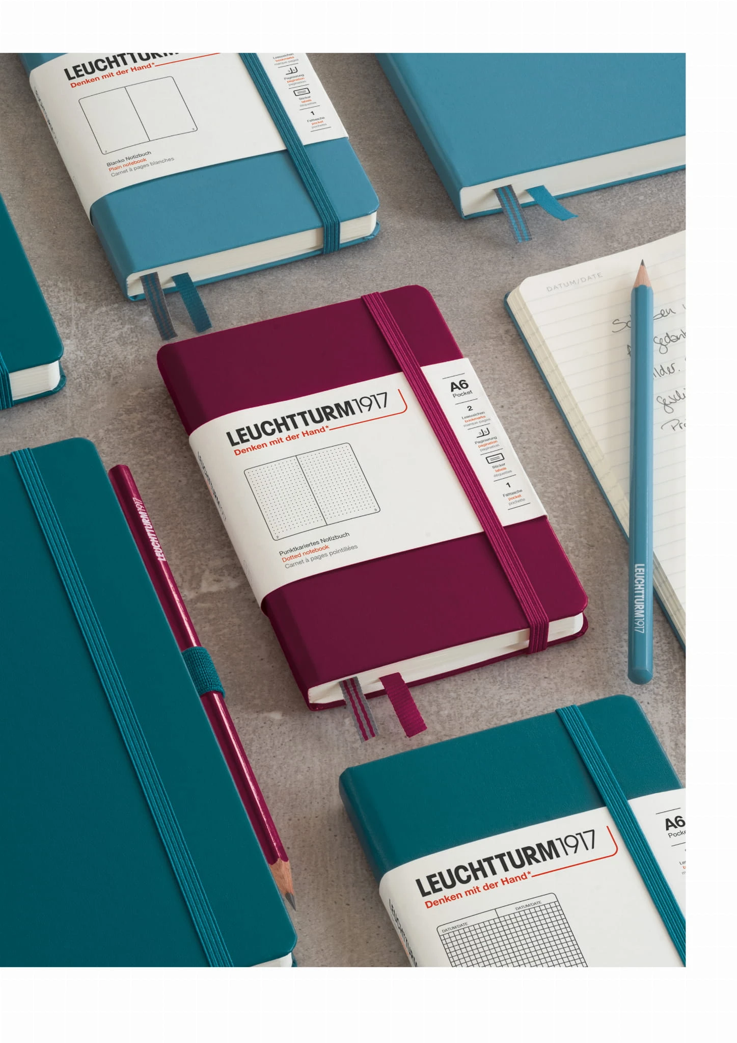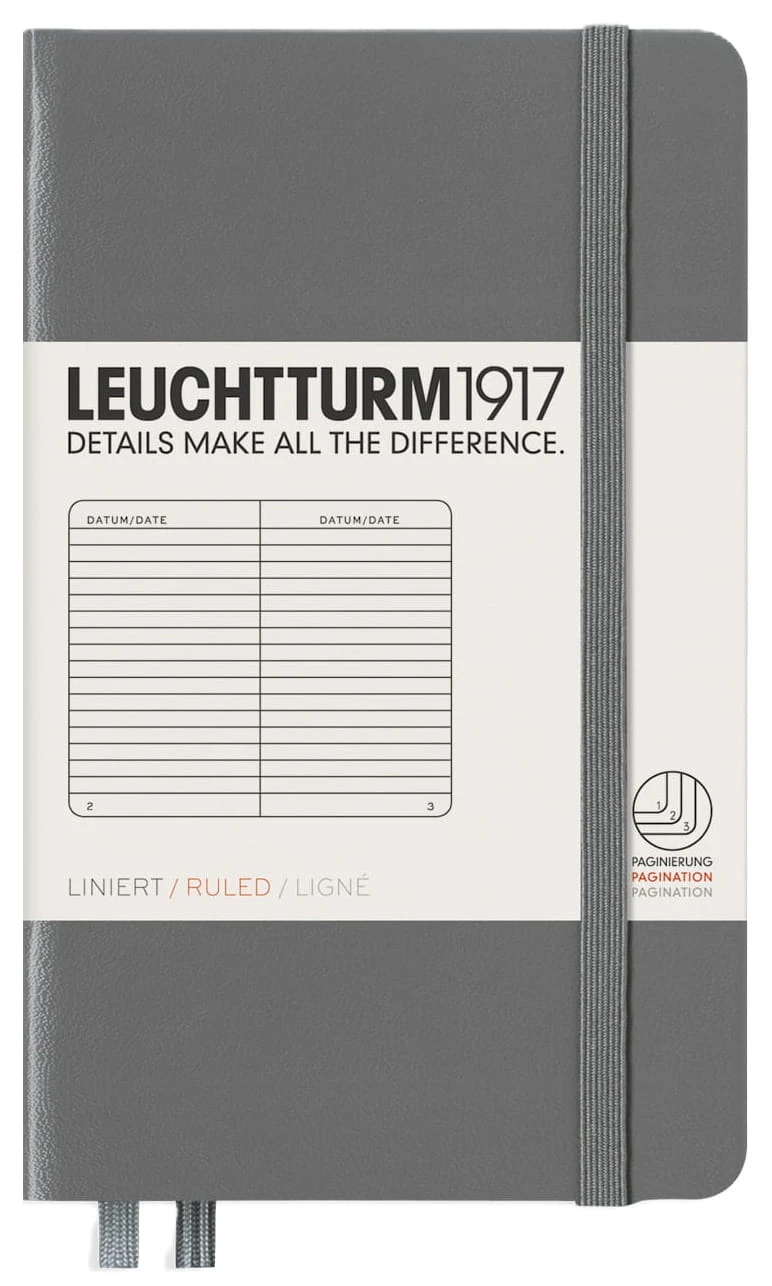 Notatniki Leuchtturm1917 z serii Pocket to wysokiej klasy produkt w rozmiarze A6 i twardej oprawie. Papier ma odcień kości słoniowej, jest bezkwasowy i bez optycznych wybielaczy, idealny do pisania piórem. Wewnątrz znajduje się pełen zestaw akcesoriów umożliwiających łatwą archiwizację: komplet naklejek do opisania okładki i grzbietu, kieszeń na luźne notatki, strona tytułowa oraz pusta tabela spisu do opisania zawartości ponumerowanych stron. Dodatkowym atutem jest szyty grzbiet umożliwiający rozłożenie notatnika na płasko. Dzięki małemu rozmiarowi notatnik zmieści się do każdej małej torby, a nawet do kieszeni.