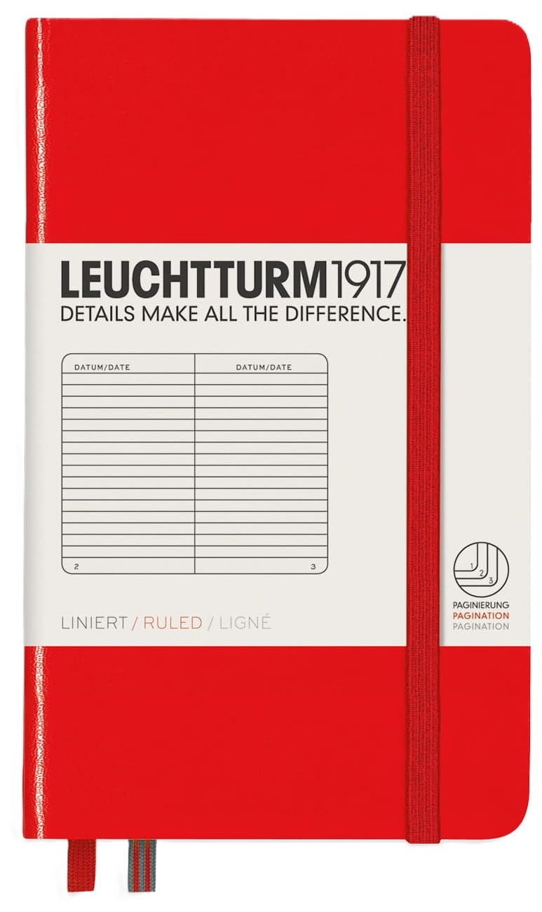 Notatniki Leuchtturm1917 z serii Pocket to wysokiej klasy produkt w rozmiarze A6 i twardej oprawie. Papier ma odcień kości słoniowej, jest bezkwasowy i bez optycznych wybielaczy, idealny do pisania piórem. Wewnątrz znajduje się pełen zestaw akcesoriów umożliwiających łatwą archiwizację: komplet naklejek do opisania okładki i grzbietu, kieszeń na luźne notatki, strona tytułowa oraz pusta tabela spisu do opisania zawartości ponumerowanych stron. Dodatkowym atutem jest szyty grzbiet umożliwiający rozłożenie notatnika na płasko. Dzięki małemu rozmiarowi notatnik zmieści się do każdej małej torby, a nawet do kieszeni.