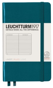 Notatniki Leuchtturm1917 z serii Pocket to wysokiej klasy produkt w rozmiarze A6 i twardej oprawie. Papier ma odcień kości słoniowej, jest bezkwasowy i bez optycznych wybielaczy, idealny do pisania piórem. Wewnątrz znajduje się pełen zestaw akcesoriów umożliwiających łatwą archiwizację: komplet naklejek do opisania okładki i grzbietu, kieszeń na luźne notatki, strona tytułowa oraz pusta tabela spisu do opisania zawartości ponumerowanych stron. Dodatkowym atutem jest szyty grzbiet umożliwiający rozłożenie notatnika na płasko. Dzięki małemu rozmiarowi notatnik zmieści się do każdej małej torby, a nawet do kieszeni.