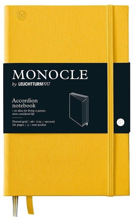 Wyjątkowa edycja limitowana zaprojektowana we współpracy z międzynarodowym, prestiżowym magazynem lifestyle Monocle. Ekskluzywny notatnik z organizerem edycja Monocle to praktyczny pomocnik organizacji. Elegancki, w twardej oprawie i specjalnym wytłoczonym złotym monogramem. Z jednej strony notatnik, z drugiej etui z oddzielnymi przegródkami. Przewodnik Monocle zawiera 20 pomysłów na spokojne, bardziej rozważne życie. Papier ma odcień kości słoniowej, jest bezkwasowy i bez optycznych wybielaczy, idealny do pisania piórem. Dodatkowym atutem jest szyty grzbiet umożliwiający rozłożenie notatnika na płasko.