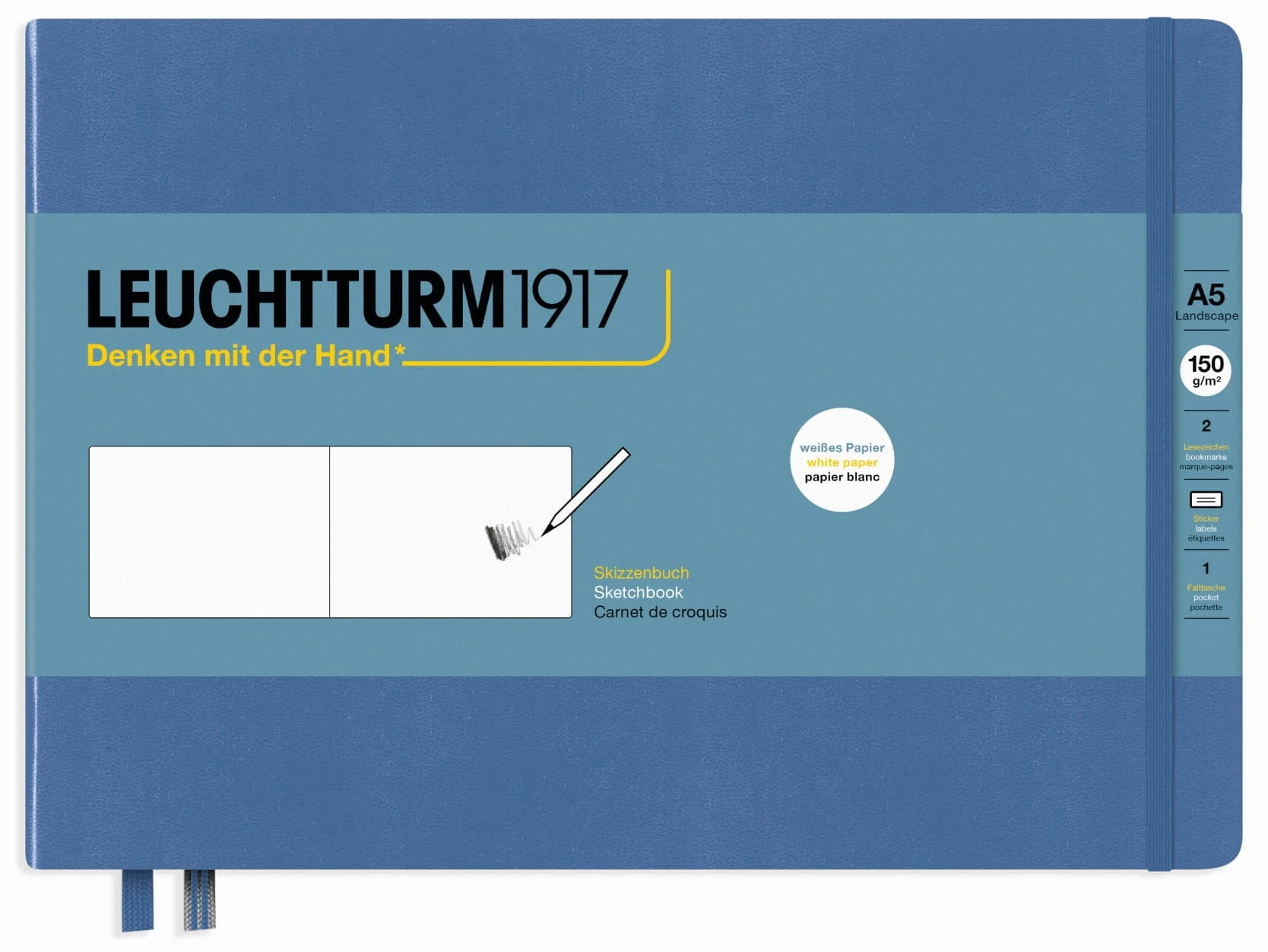 Szkicownik Leuchtturm1917 wysokiej klasy produkt w twardej oprawie przeznaczony do szkicowania i rysowania. Posiadają bezkwasowy papier o wysokiej odporności na wydrapywanie i wymazywanie, o podwyższonej gramaturze. Bardzo dobrze się sprawdza do używania w plenerze, polecany jest do wszystkich suchych technik rysunkowych takich jak: ołówek, węgiel, sepia, sangwina, pastele, ale także sprawdzi się z wykorzystaniem pisaków, cienkopisów, a także tuszu i Ecoline. To elegancki, szyty notatnik, w formie książki posiadający wygodne zamknięcie na gumkę. Na pierwszej stronie znajduje się specjalne miejsce na wpis personalizacyjny. Szkicownik dodatkowo wyposażony został w naklejki, 3 standardowe naklejki "zeszytowe" oraz 3 naklejki grzbietowe, które również mogą służyć personalizacji. Szkicowniki zadowolą swoją jakością zarówno profesjonalistów, jak i osoby rozpoczynające przygodę z rysunkiem.