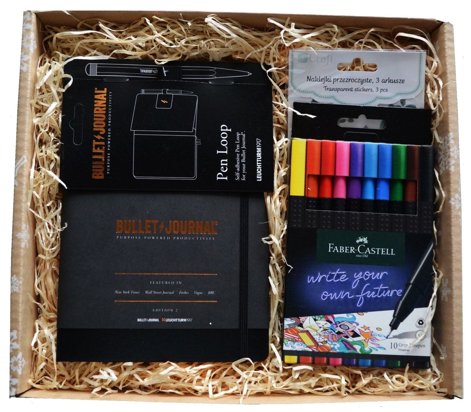 W upominkowym pudełku znajduje się notes dedykowany do "Bullet Journal", zawierający porady i wskazówki dotyczące jego prowadzenia, wraz z przeznaczonym do niego "pen loopem" czyli pętelką do przechowywania długopisu/pióra/ołówka. Wysokiej jakości kolorowe cienkopisy marki Faber-Castell świetnie nadają się do pisania w notesie, minimalizując ryzyko przebijania tuszu. Dodatkowo strony można ozdobić przy pomocy naklejek z przezroczystym tłem - idealnie "zlewających się" z kartką. Wszystkie elementy razem stanowią świetny zestaw dla każdego fana journalingu, zarówno tych dopiero rozpoczynających przygodę z analogowym notowaniem, jak i doświadczonych twórców.