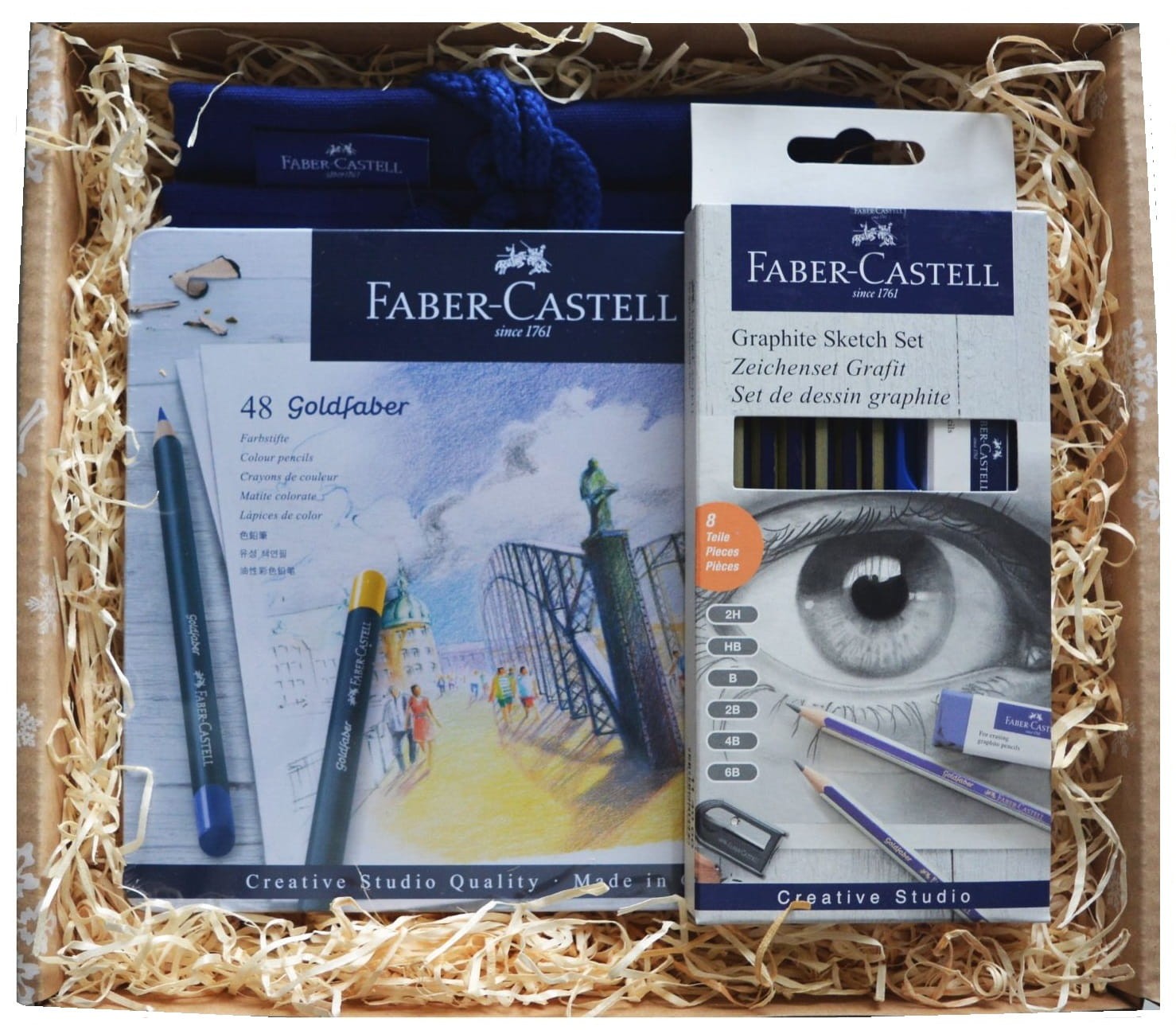 W upominkowym pudełku znajduje się duży zestaw kredek ołówkowych Goldfaber renomowanej marki Faber-Castell, które z powodzeniem nadają się zarówno dla osób rozpoczynających naukę rysowania, jak i doświadczonych artystów. Zestaw do szkicowania z tej samej serii zawiera sześć ołówków, wraz z niezbędnymi akcesoriami - gumką i temperówką. Najpotrzebniejsze kredki i ołówki można przełożyć do bawełnianego piórnika rolowanego, który świetnie nadaje się m.in. do pracy w plenerze czy podróży. Całość stanowi świetny zestaw startowy do nauki szkicowania i rysunku.