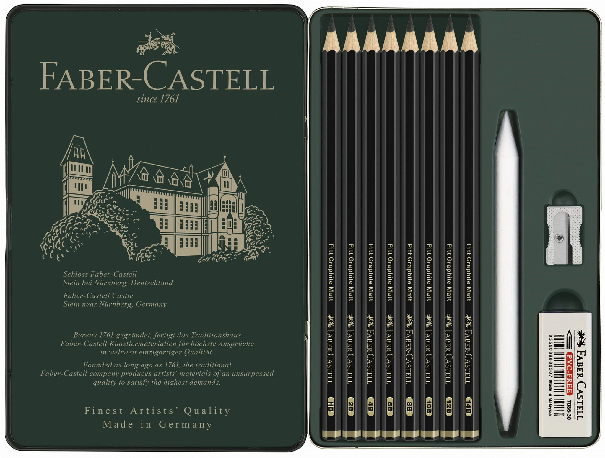 - Zestaw do szkicowania Matt 11 sztuk, zawierający: 8 ołówków o stopniach twardości HB, 2B, 4B, 6B, 8B, 10B, 12B i 14B, wiszer do papieru, gumka i temperówka w metalowym opakowaniu. Innowacyjny Pitt Graphite Matt został specjalnie opracowany, aby zredukować odbicia światła na papierze i stworzyć efekt maksymalnej głębi, dzięki różnym stopniom twardości. To niezwykle matowe, najwyższej jakości grafitowe ołówki dla artystów. Szczególnie nadają się do monochromatycznych prac grafitowych. Doskonała odporność na pękanie. Produkcja neutralna pod względem emisji dwutlenku węgla. Drewno z certyfikowanego zrównoważonego leśnictwa.