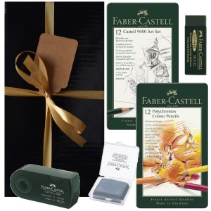 W upominkowym pudełku znajdują się przybory plastyczne renomowanej marki Faber-Castell. Podstawowy zestaw znanych i lubianych kredek Polychromos jest idealny do zapoznania się z kredkami z tej serii. Zestaw kultowych ołówków 9000 w metalowym opakowaniu to ulubieniec artystów i ilustratorów, świetnie nadający się zarówno do nauki rysowania jak i do wykonywania prac przez profesjonalistów. W zestawie znajdują się również przydatne akcesoria - gumka chlebowa w praktycznym etui, temperówka i niebrudząca gumka Dust-Free. Całość stanowi kompletny zestaw do rysunku artystycznego i szkicowania.