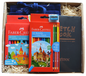 W upominkowym pudełku znajdują się wysokiej jakości kredki i flamastry renomowanej marki Faber-Castell, idealne zarówno do szkoły jak i nauki rysunku w domu lub na zajęciach. Szkicownik w formacie A5 jest niezbędnikiem młodego artysty, a najpotrzebniejsze kredki i ołówki można przełożyć do bawełnianego piórnika rolowanego, który świetnie nadaje się m.in. do pracy w plenerze czy podróży. Całość stanowi świetny zestaw startowy do nauki szkicowania i rysunku.