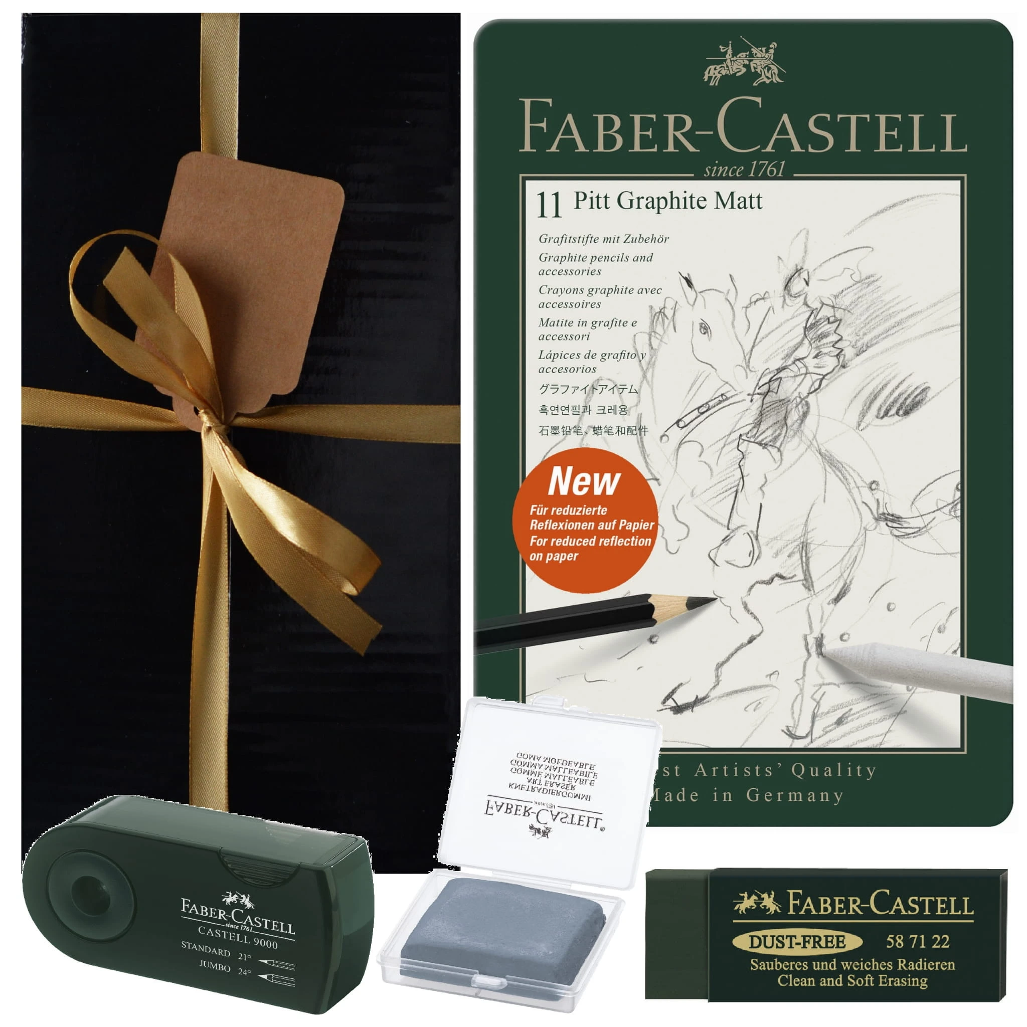 W upominkowym pudełku znajdują się przybory plastyczne renomowanej marki Faber-Castell. Zestaw ultra-matowych ołówków Matt w metalowym opakowaniu to specjalnie opracowany produkt, mający za zadanie zredukować odbicia światła na papierze i stworzyć efekt maksymalnej głębi. W zestawie znajdują się również przydatne akcesoria - gumka chlebowa w praktycznym etui, temperówka i niebrudząca gumka Dust-Free. Całość stanowi kompletny zestaw do szkicowania.