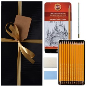 W upominkowym pudełku znajduje się zestaw ołówków 1500 znanej i lubianej marki Koh-I-Noor, które z powodzeniem nadają się zarówno dla osób rozpoczynających naukę rysowania, jak i doświadczonych artystów. Wraz z dołączonymi do zestawu gumką chlebową i gumką precyzyjną 6312 (świetnymi zarówno do ścierania, jak i rozjaśniania i tworzenia przejść między kolorami) stanowią świetny zestaw startowy do nauki szkicowania.