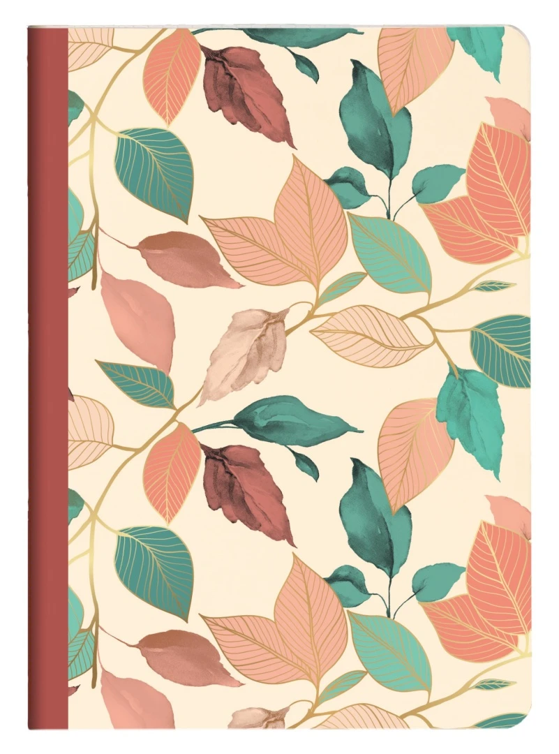 - Zeszyt posiada półtwardą okładkę ze sztywnego papieru z matowym wykończeniem i złotymi detalami oraz grzbiet przeszyty nicią.